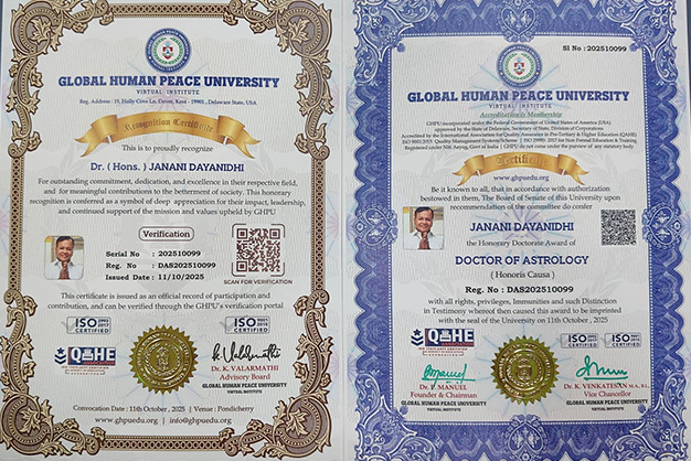 Recognised for outstanding contribution to astrology, spiritual guidance, and service to society. This honorary doctorate celebrates years of dedication, teaching, and uplifting countless lives.